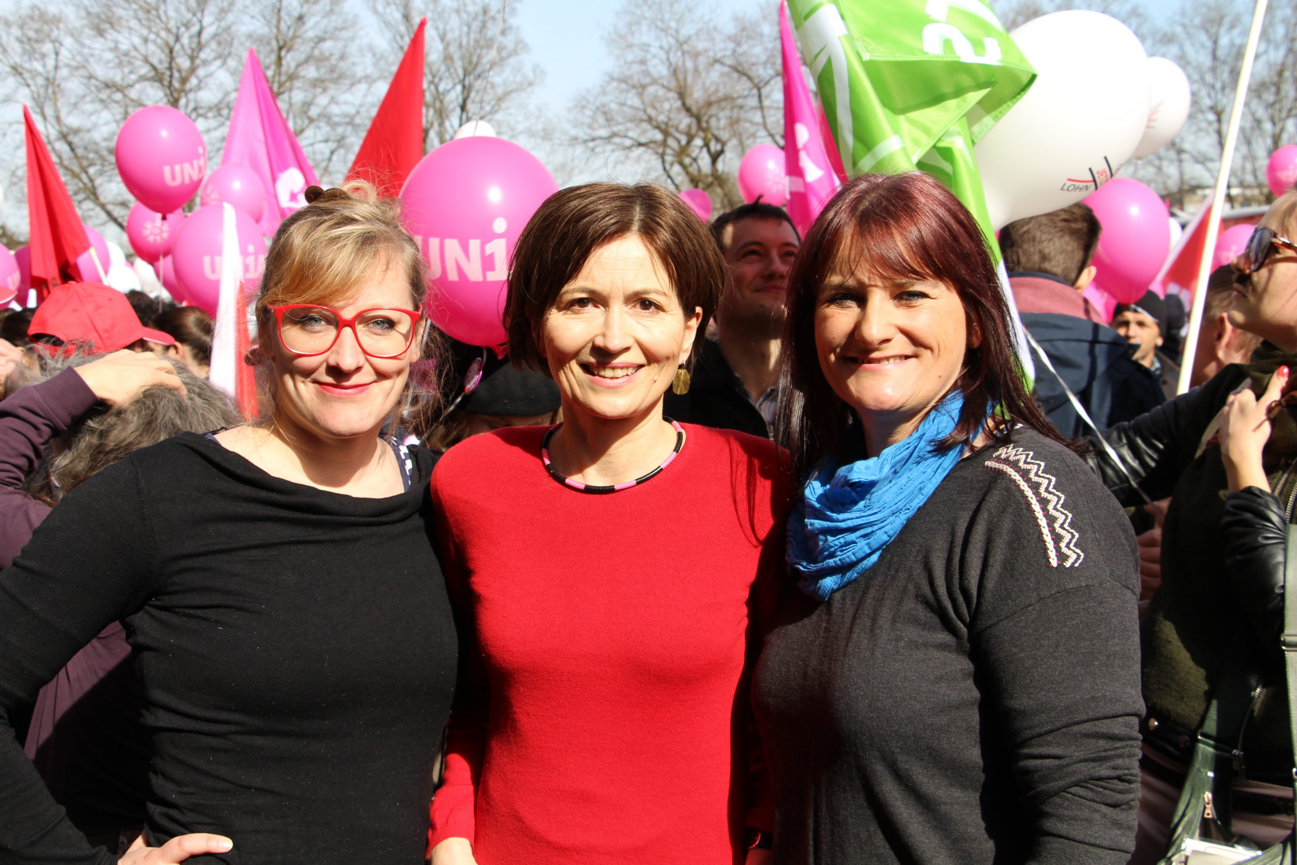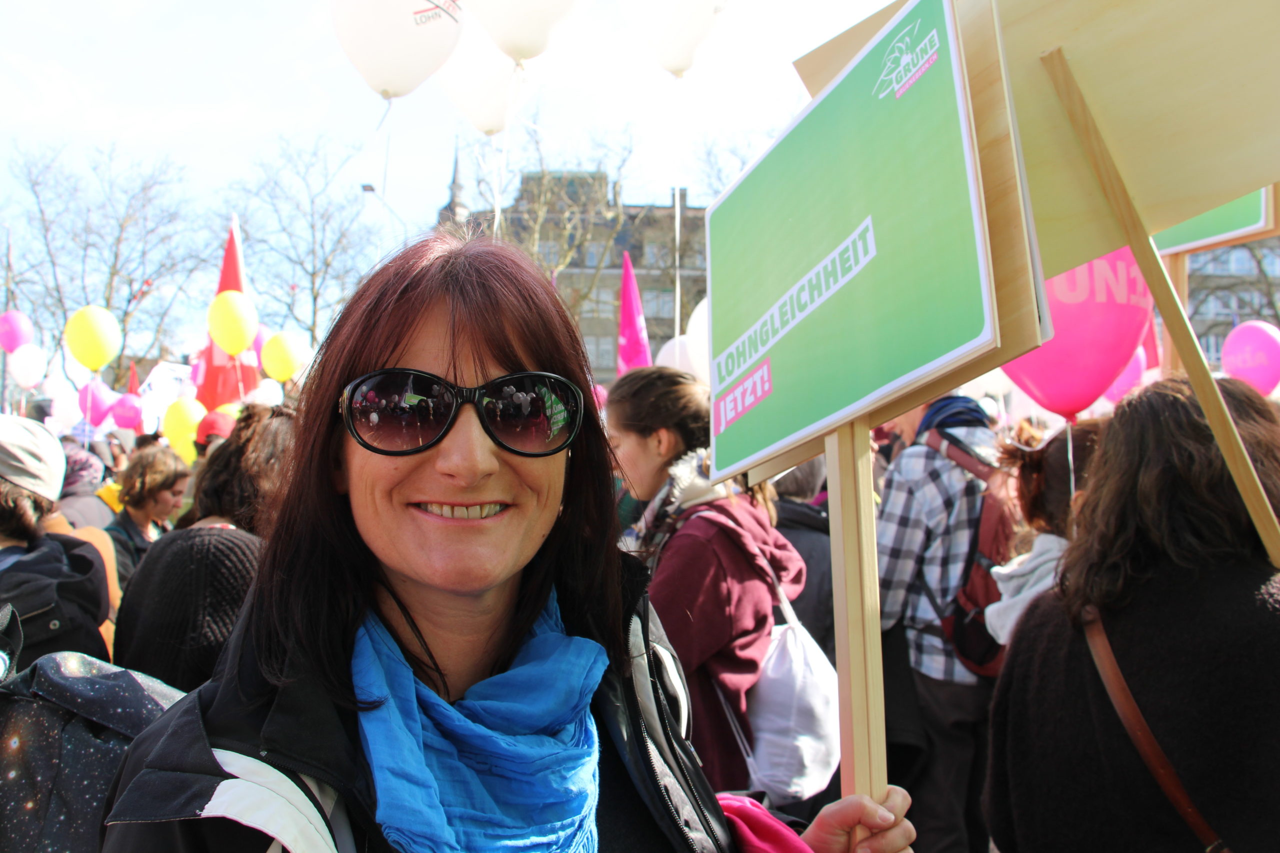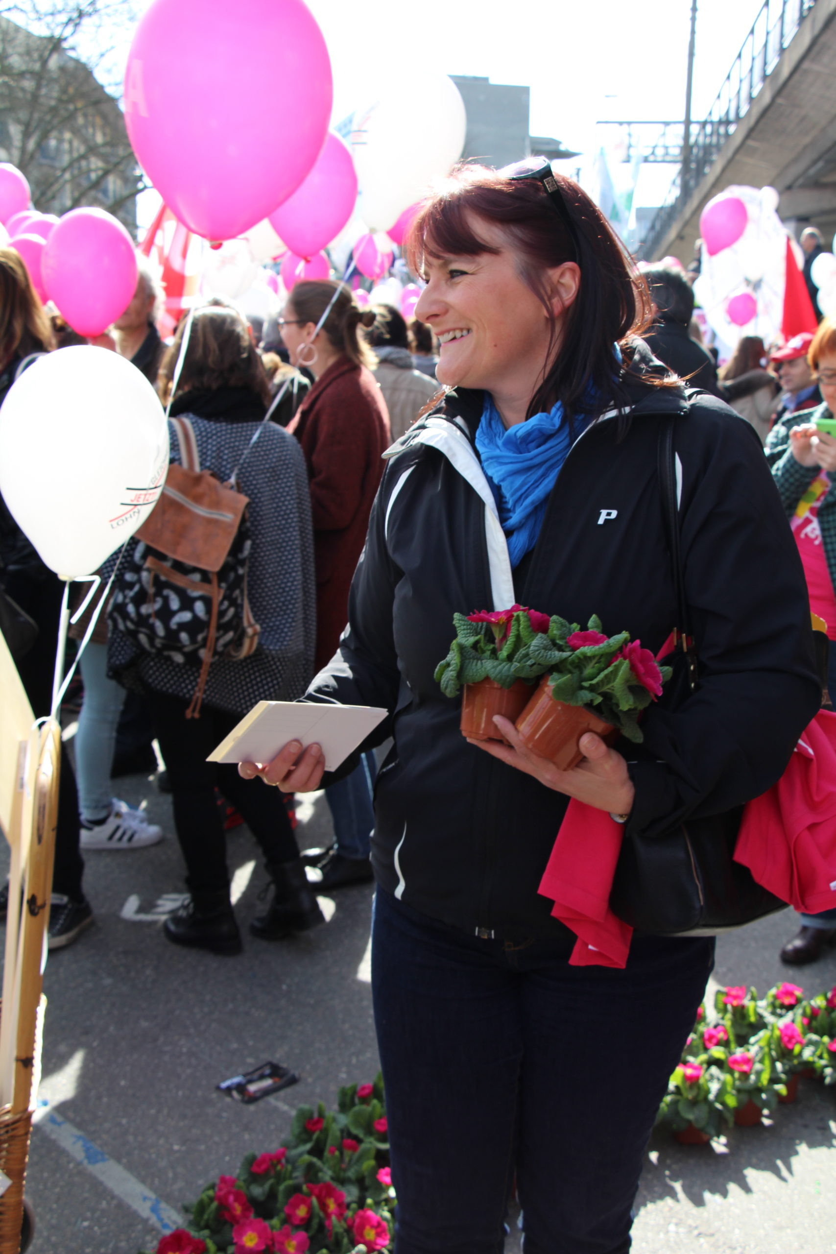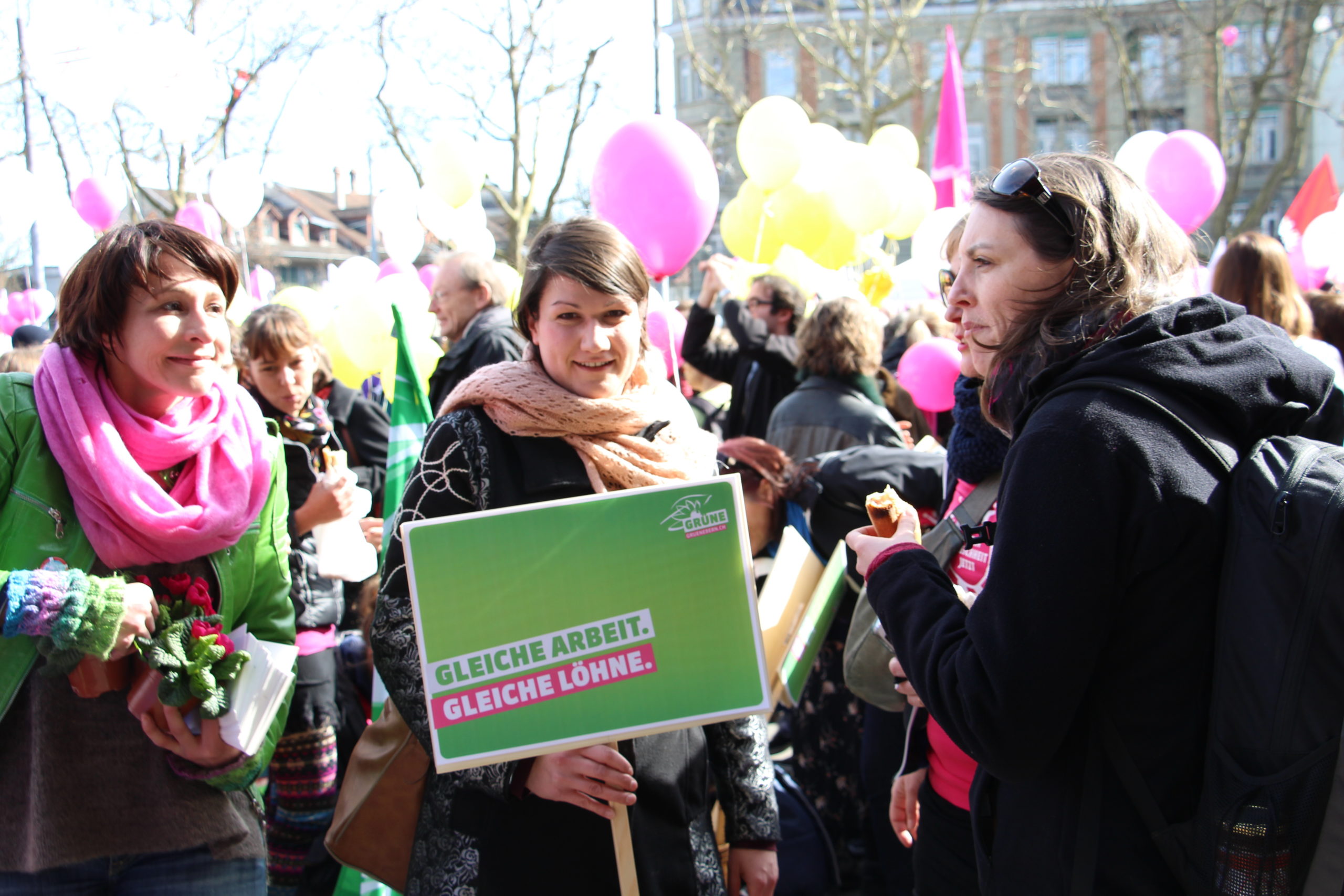Frauen verdienen in der Schweiz 18,9 Prozent weniger als Männer. Sie müssen somit bis zum 9. März, dem „Equal Pay Day“, arbeiten, um für gleichwertige Arbeit denselben Lohn zu erhalten, den Männer schon am 31. Dezember des Vorjahres in der Tasche haben. Ein breites, parteiübergreifendes Bündnis von Frauenorganisationen und viele Frauen aus der Wirtschaft haben mit Blick auf den internationalen Frauentag und den Equal Pay Day zu einer nationalen Kundgebung „Lohngleichheit jetzt“ in Bern aufgerufen. Gemeinsam mit den Nationalratskandidatinnen der Grünen haben Ständeratskandidatin Christine Häsler und die Nationalrätinnen Regula Rytz und Aline Trede an der Kundgebung heute pinkfarbene Primeln verteilt.