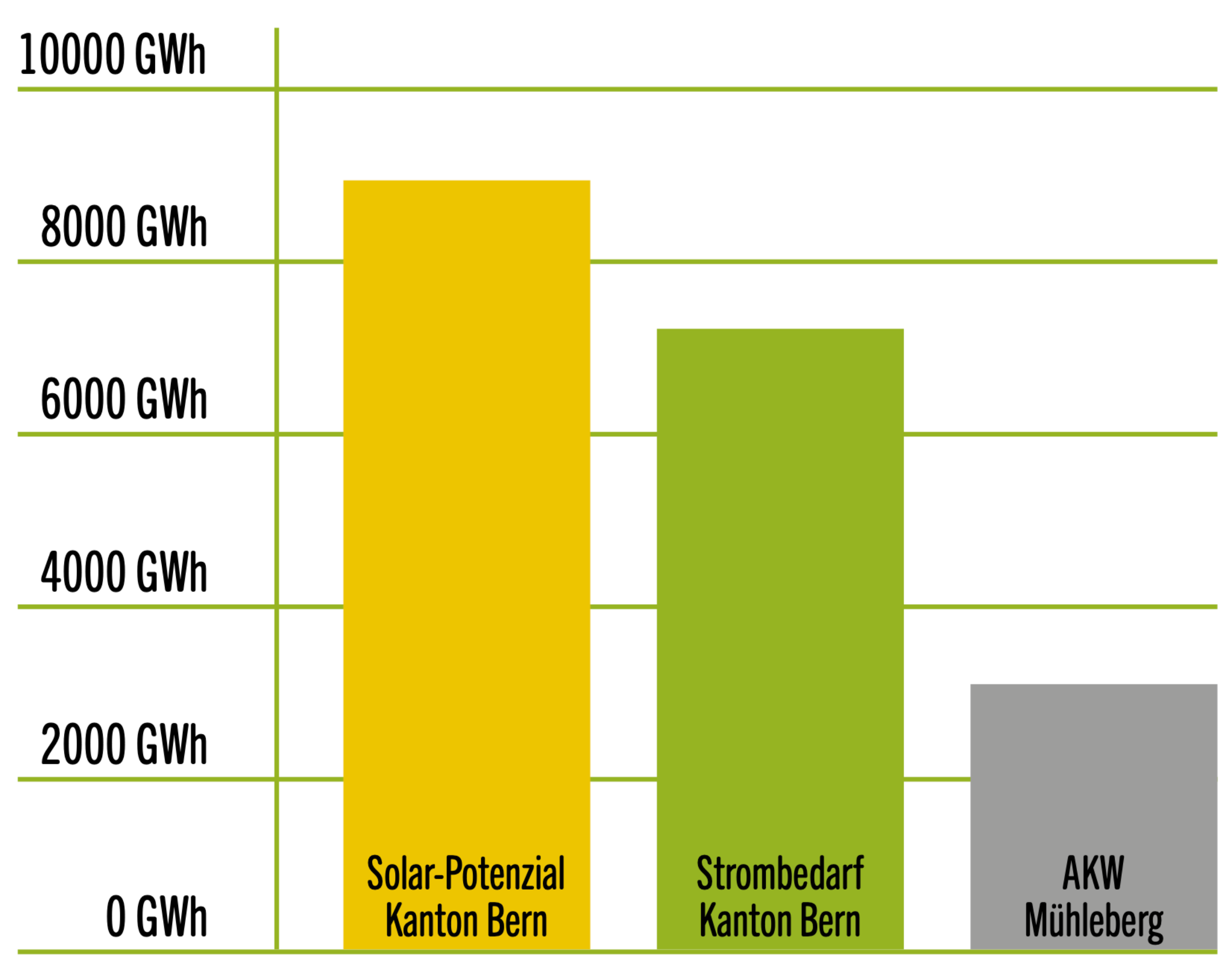 Der Kanton Bern verfügt über ein riesiges Solar-Potenzial. Mit gut nutzbaren Dachflächen können pro Jahr 9000 GWh Strom produziert werden. Das ist drei Mal mehr, als das AKW Mühleberg jährlich produziert hat. Und mehr als der heutige Strombedarf des Kantons Bern. Mit einem raschen Zubau der Solarenergie im Kanton Bern leisten wir also einen wichtigen Beitrag zur nationalen Energiewende und zum Klimaschutz.